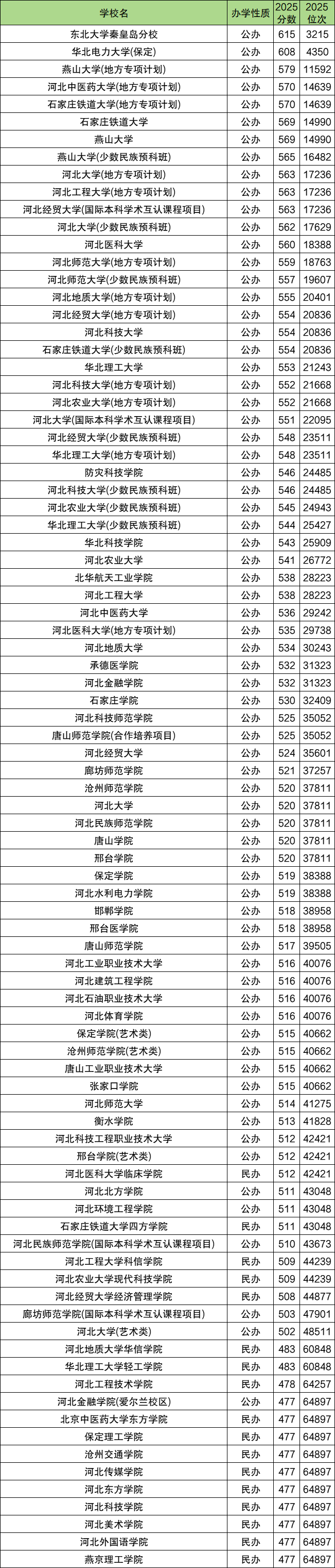 河北本科各大学在物理组录取分数线及位次排名一览表: