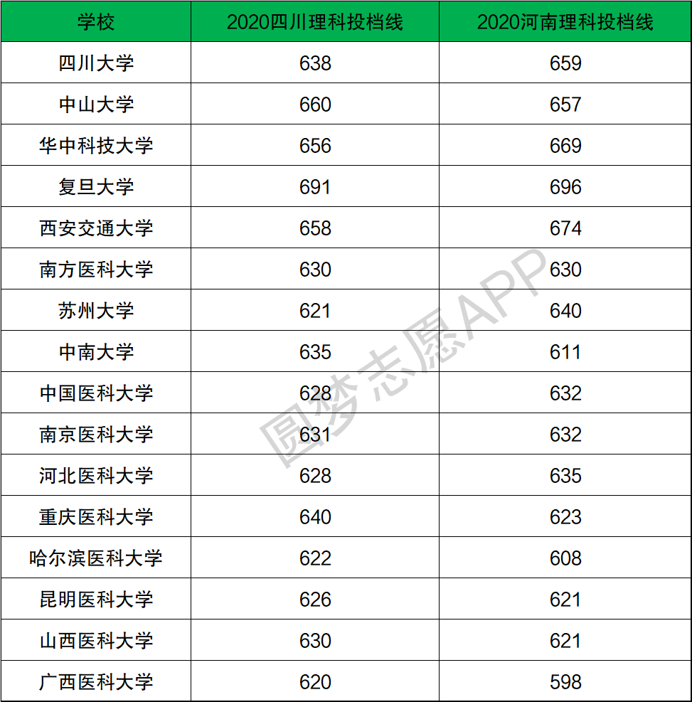 根据2020年四川和河南的理科投档线,上述大学分数线情况如下: