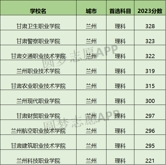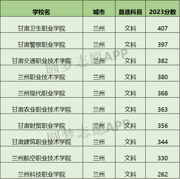 1、兰州职业技术学院: 2023年文科最低分数线为380分,理科最低319分。
