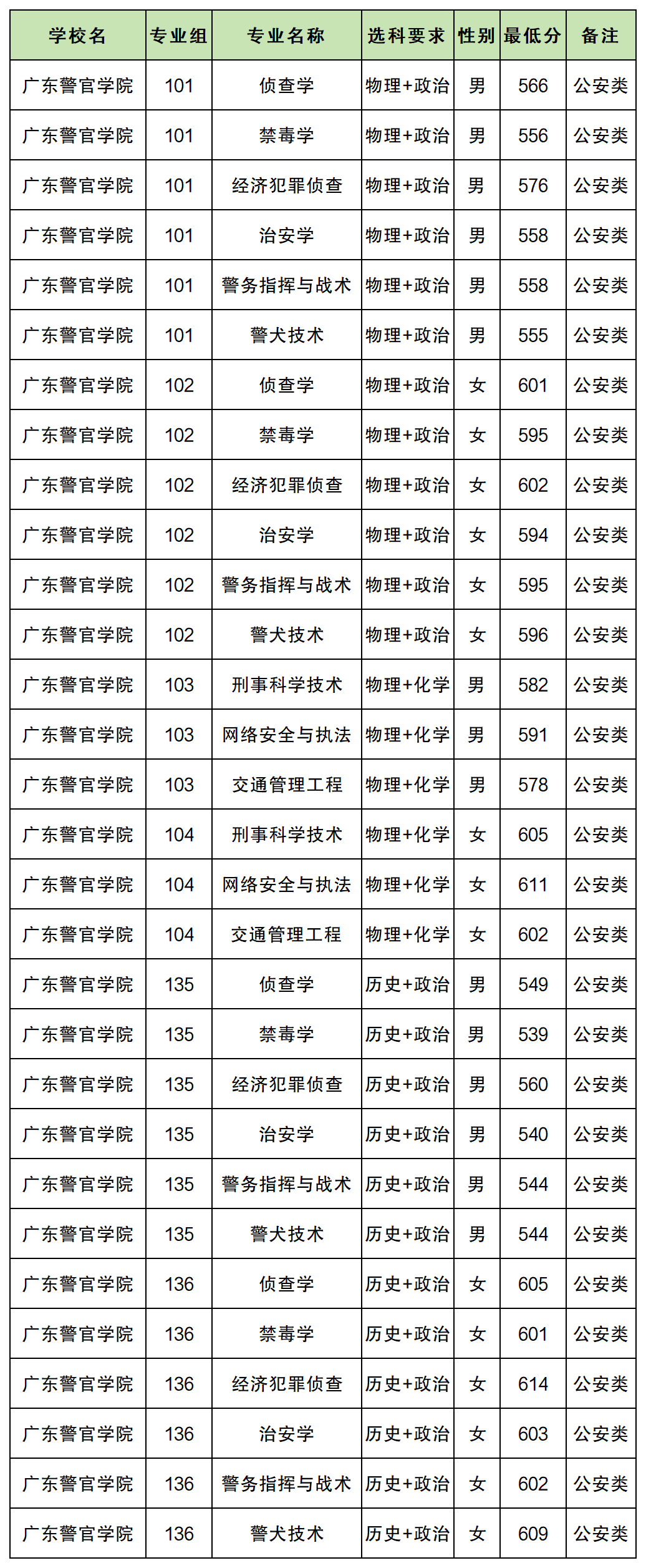 广东警官学院101组(男生),物理类最低录取分数线为555分;