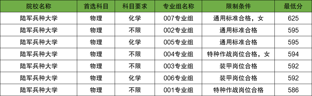 在物理类7个专业组招生中,最高分专业组为007专业组(化学)(通用标准合格),分数线为625分;最低分专业组为001专业组(不限)(特种作战岗位合格),分数线为586分。