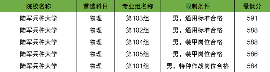 在物理类5个专业组招生中,最高分专业组为第103组(通用标准合格),要求只限男生报考,分数线为591分;最低分专业组为第101组(特种作战岗位合格),要求只限男生报考,分数线为584分。