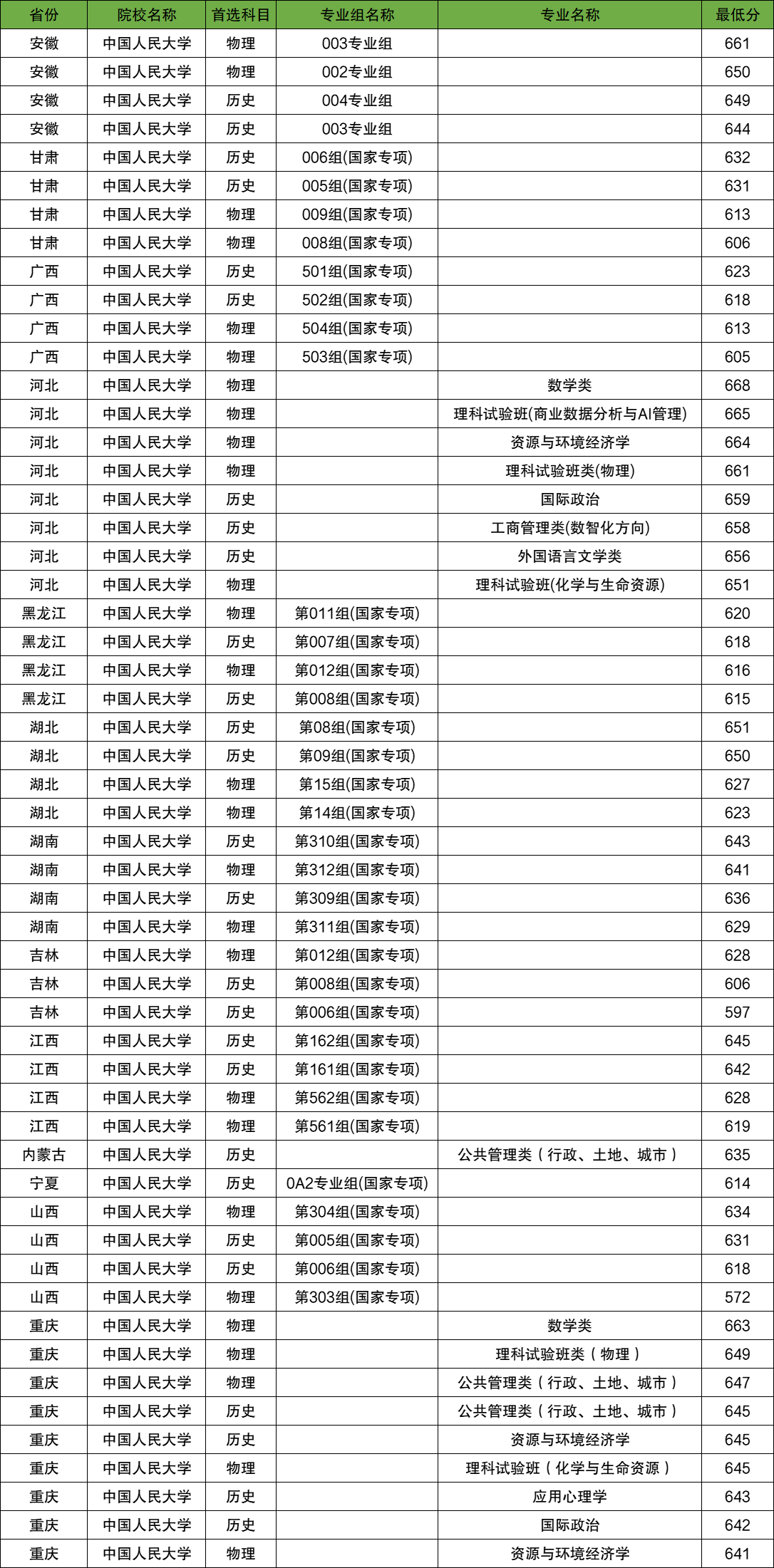 以下为2025年中国人民大学本科批部分省份各专业招生分数线。