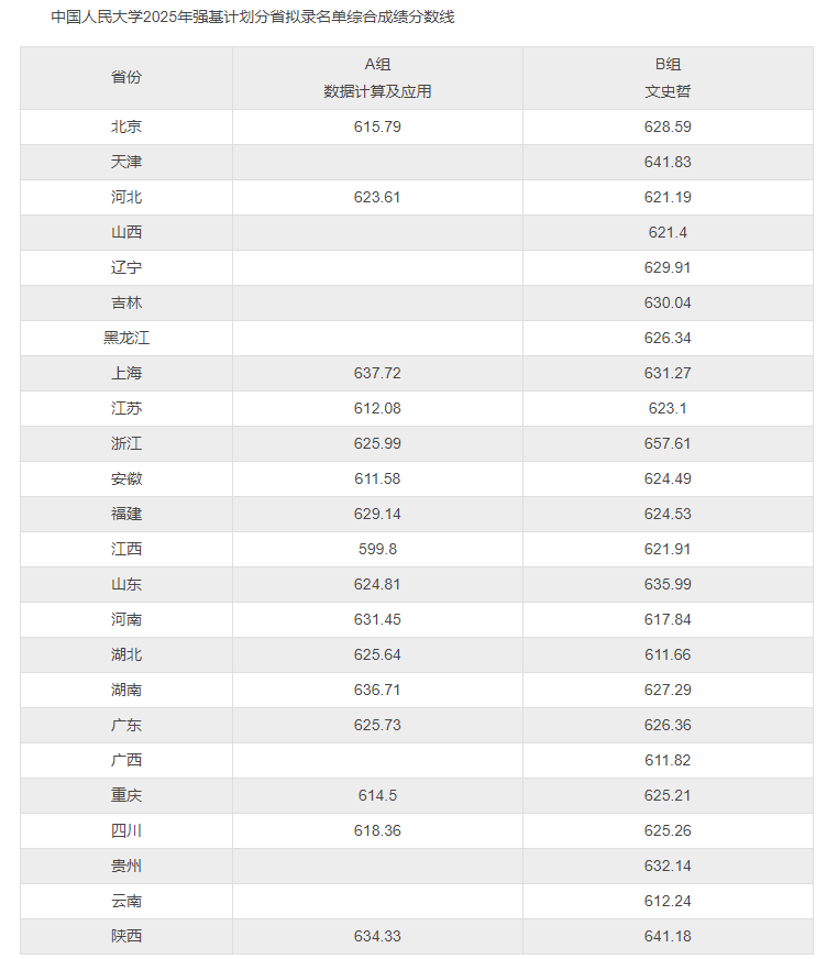 以下为2025年中国人民大学强基计划各省录取最低综合成绩分数线(综合成绩=0.85×(高考成绩(不含加分)/高考满分)×750+0.15×(校考成绩/校考满分)×750)