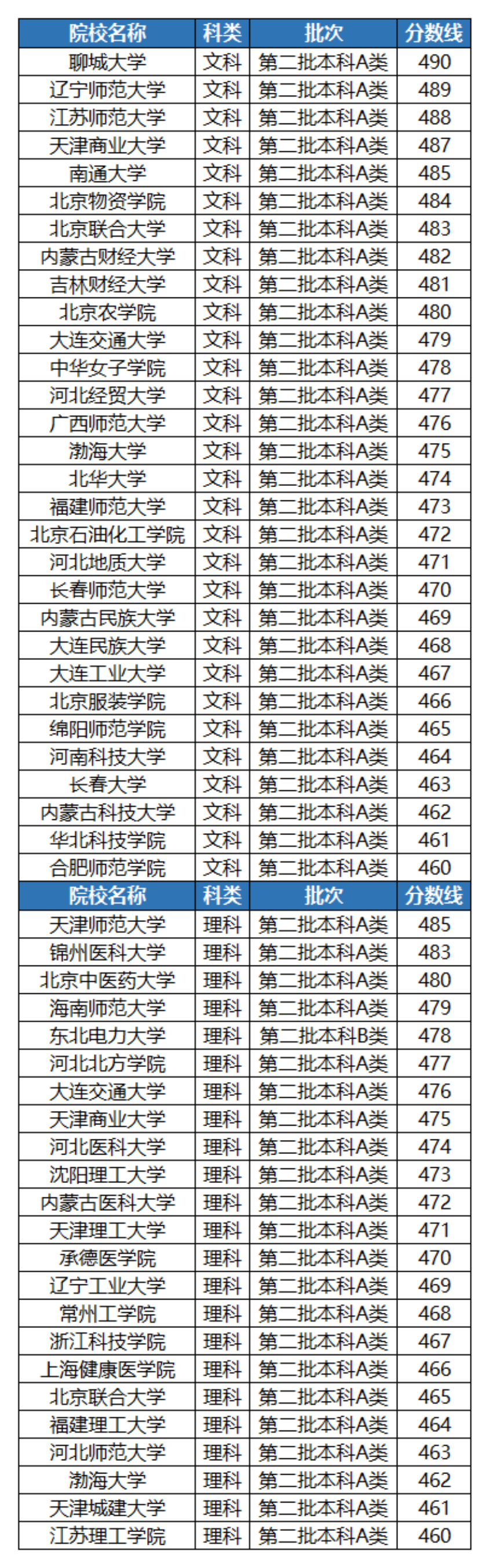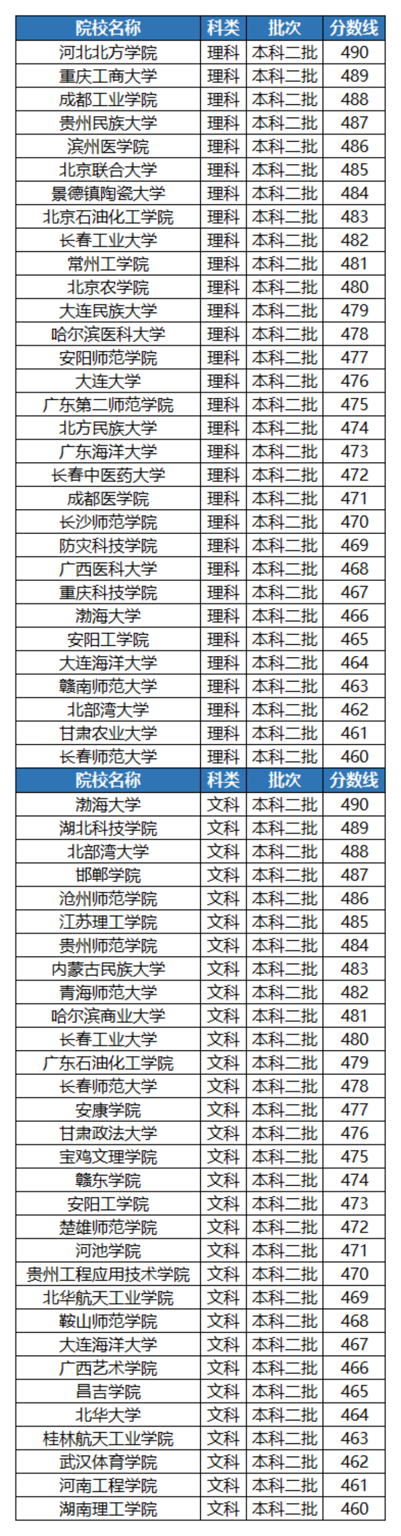 此外,460-490分的省属重点二本大学还有沈阳大学(450分)、厦门理工学院(456分)、井冈山大学(458分)、北华大学(464分)等院校。
