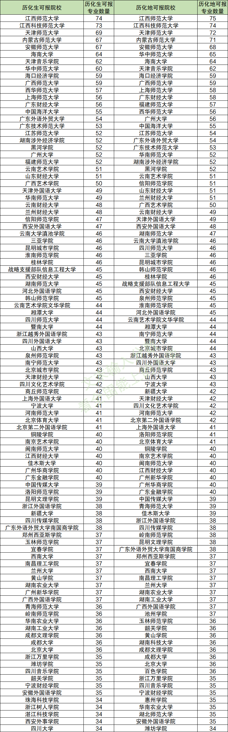 如江西师范大学历化生可报74个专业,历化地能报75个专业;天津师范大学历化生可报69个专业,历化地可报72个专业;内蒙古师范大学历化生可67个专业,历化地可报71个专业等。
