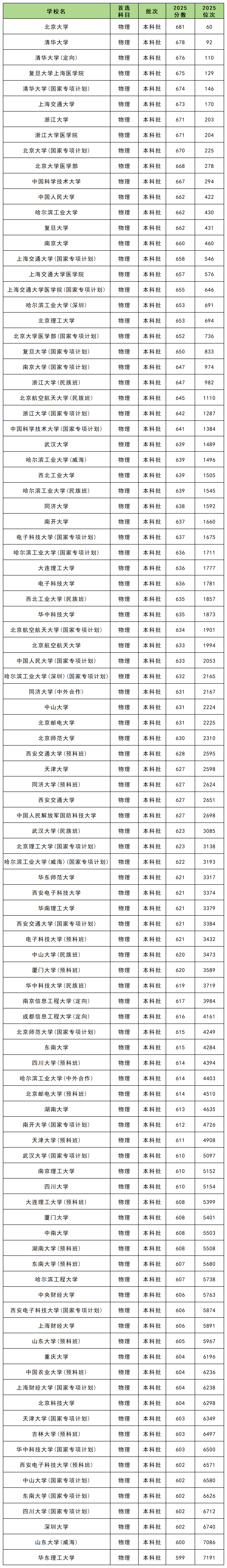 如下为各位展示的是2025年贵州本科批物理类重点院校的Top100录取分及位次情况: