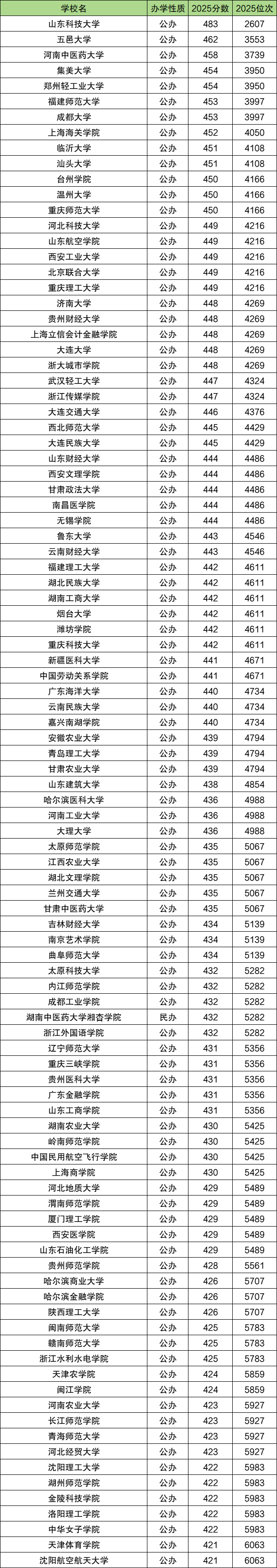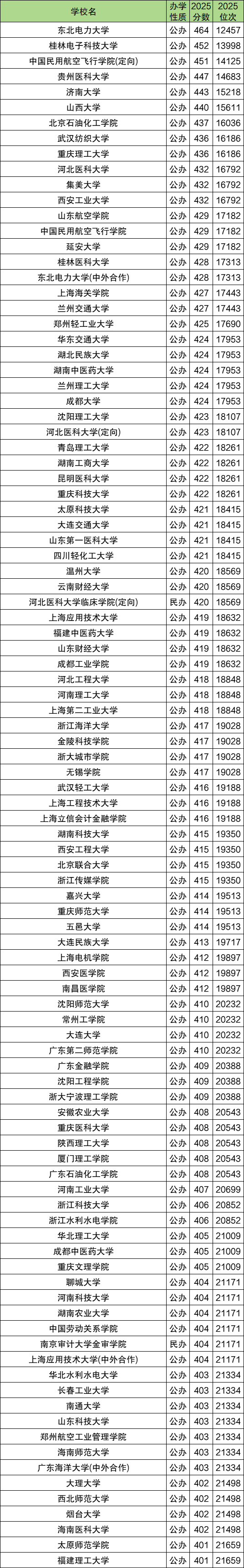 理科高分段的二本大学有:东北电力大学、桂林电子科技大学、中国民用航空飞行学院(定向)、贵州医科大学、济南大学、山西大学、北京石油化工学院等,这些大学2025年高考最低录取分数线均在430分及以上,需要过二本线150分及以上才能被录取。