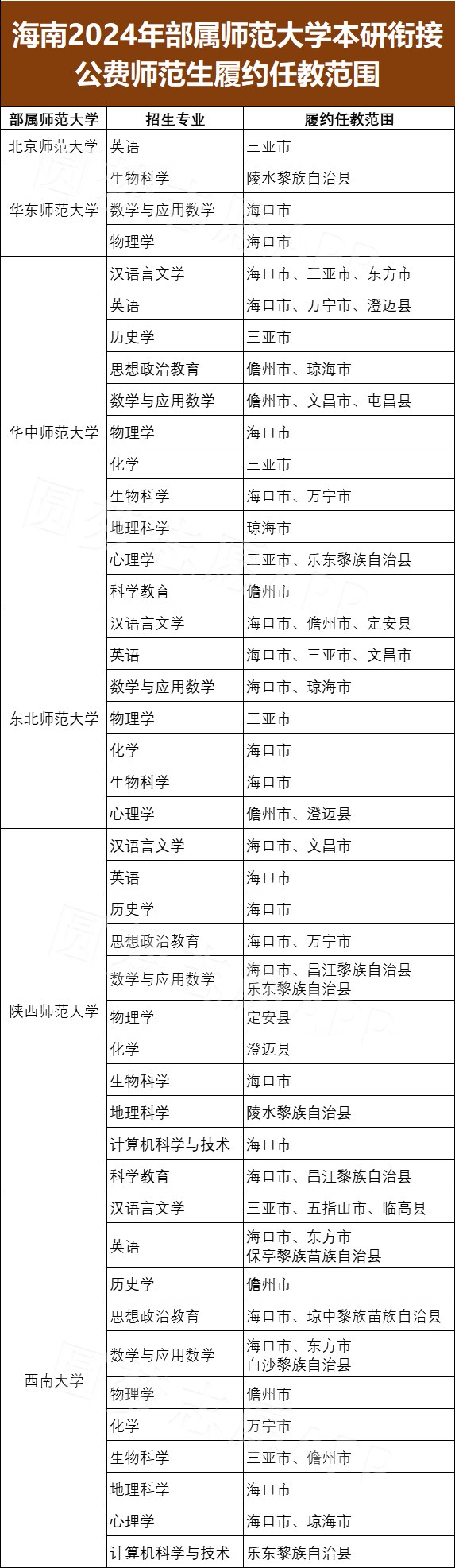 除了以上地方公费定向培养院校外,教育部直属师范院校(北京师范大学、东北师范大学、华东师范大学、华中师范大学、陕西师范大学、西南大学)也会在海南招收一批本研衔接公费师范生,这部分公费师范生就需要定向就业,多以也算在定向公费师范生的范围内。
