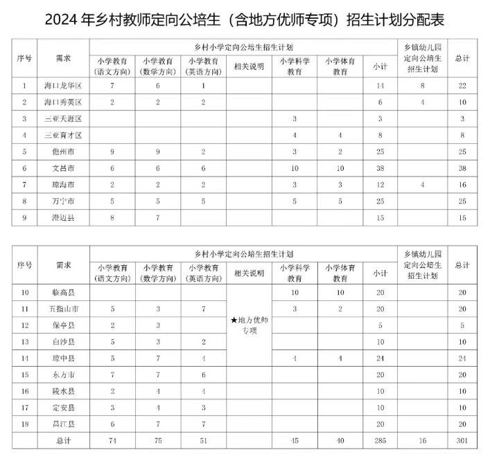 2025年海南公费师范生招生计划暂未公布,参考2024年数据,海南实施定向公费师范生招生的院校有海南师范大学、琼台师范学院等,招生计划为本科层次小学教育200人、专科层次学前教育16人等,具体的信息请看下文。