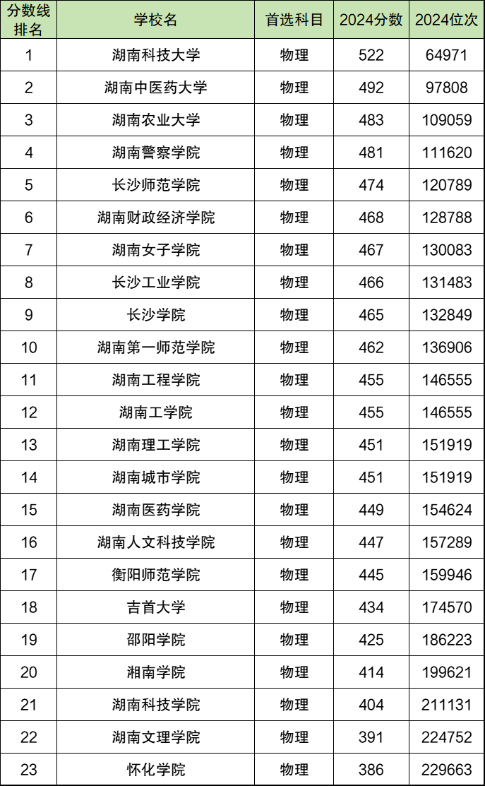 其中,分数线排名第一的公办二本大学是湖南科技大学(522分);分数线排名最后的公办二本大学是怀化学院(386分)。