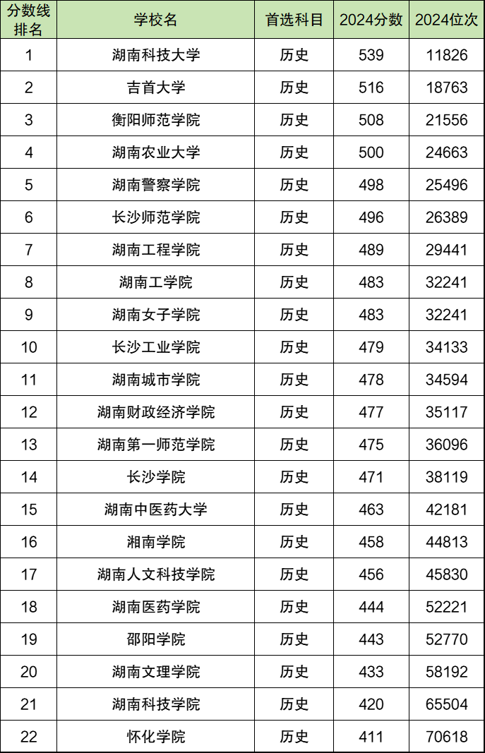 2024年湖南公办二本大学在历史类的最低录取分数线位于411分~539分之间。