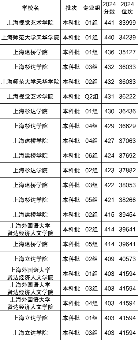 2024年各上海的民办本科大学在上海市收分最低的是上海立达学院,2024年最低分为403分,最低位次为41594。