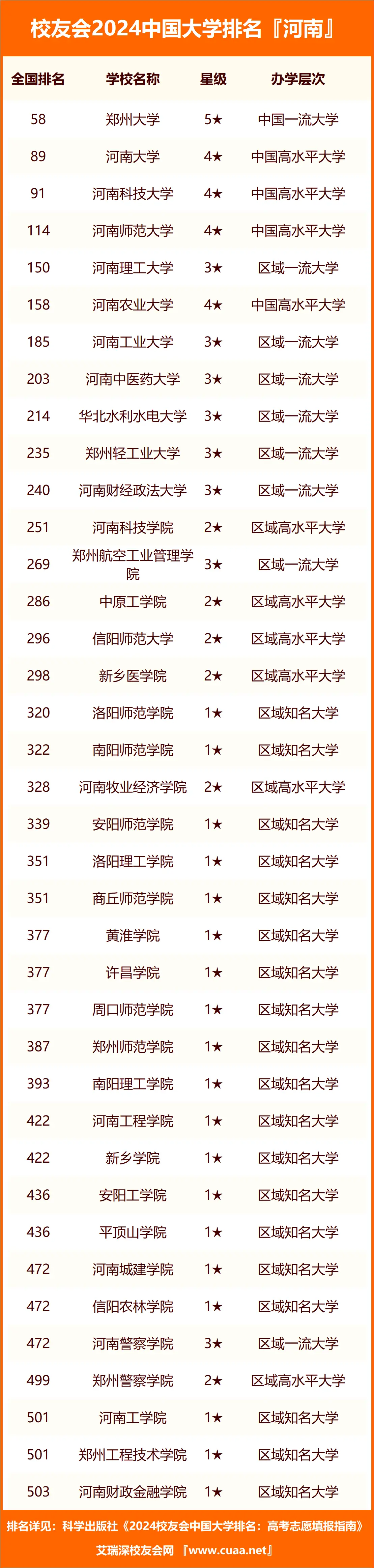 以下为2024年校友会河南省本科大学排名,各位河南省的同学和家长可作为参考。