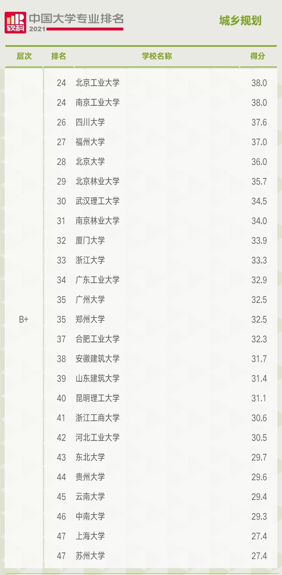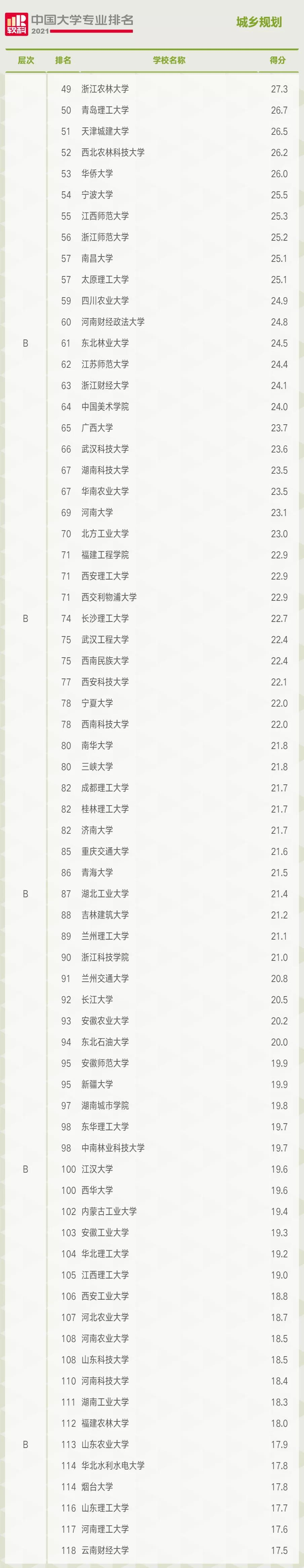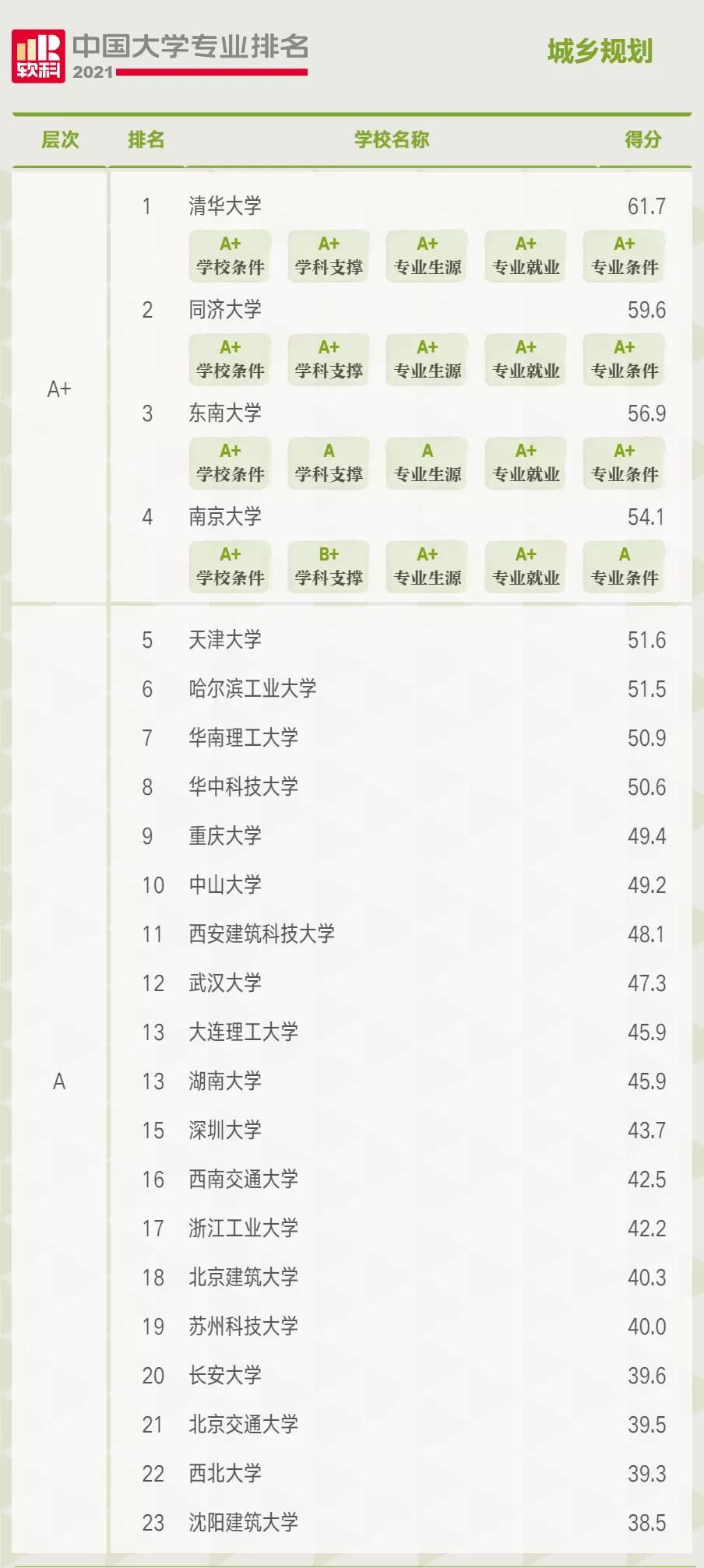以下数据来自软科2021中国大学专业排名-城乡规划专业大学排名: