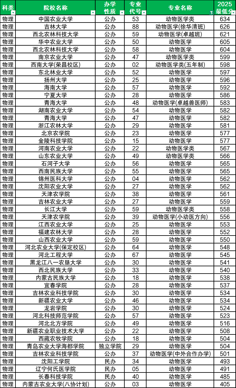 2025动物医学录取分数线范围在405分-634分之间,各大学最低分详情如下:中国农业大学634分、华中农业大学605分、扬州大学596分、湖南农业大学582分等。