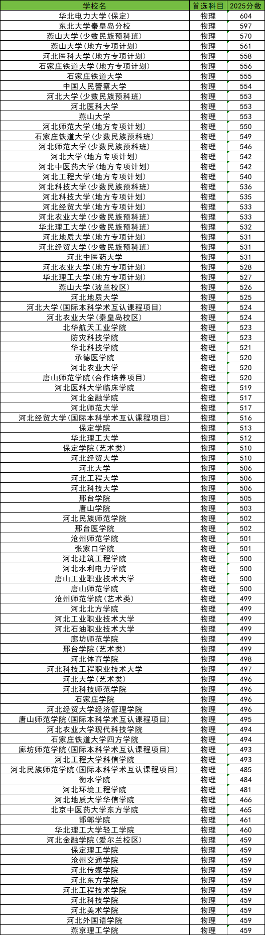 下面是2025年河北省内本科高校物理类录取分数线一览表: