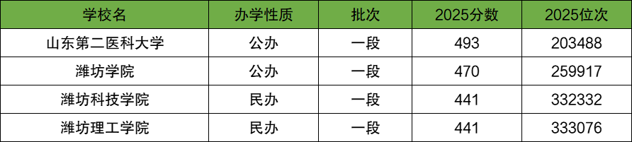 2025年潍坊本科各大学中,分数线最高、最难考的院校是山东第二医科大学,2025年录取分数493分,录取位次203488位;