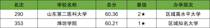 潍坊各大学排名为:第1名山东第二医科大学、第2名潍坊学院等;而潍坊各大学最低录取分数线则是山东第二医科大学493分,潍坊学院470分等。