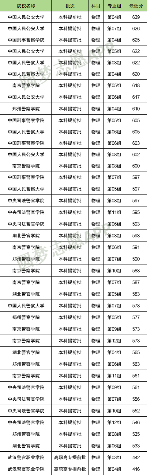 在湖北物理类投档分数线最高的院校专业组是中国人民公安大学04组,2024年分数线是639分;投档分数线最低的院校专业组是武汉警官职业学院04组,2024年分数线是416分。