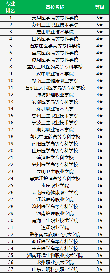 水平等级是4星级的有12所,包含白城医学高等专科学校(全国第4名)、石家庄医学高等专科学校(全国第5名)、重庆医药高等专科学校(全国第6名)。