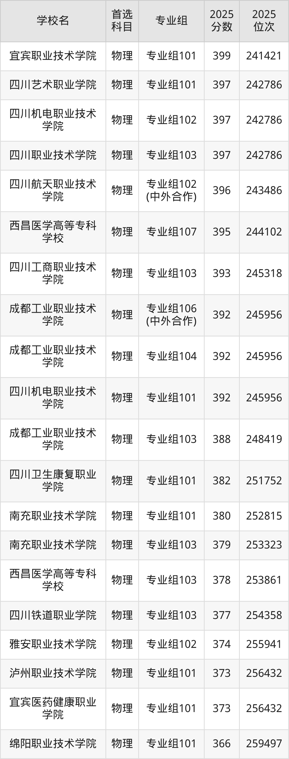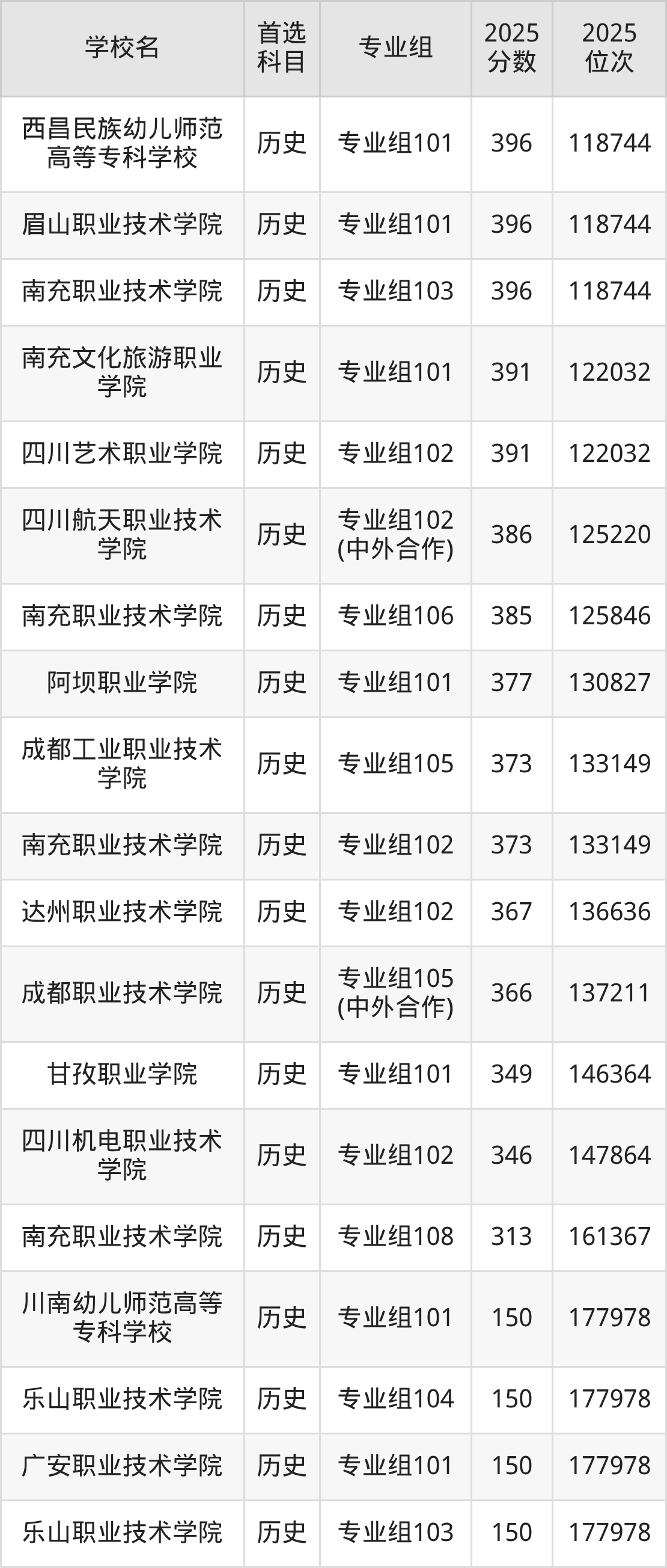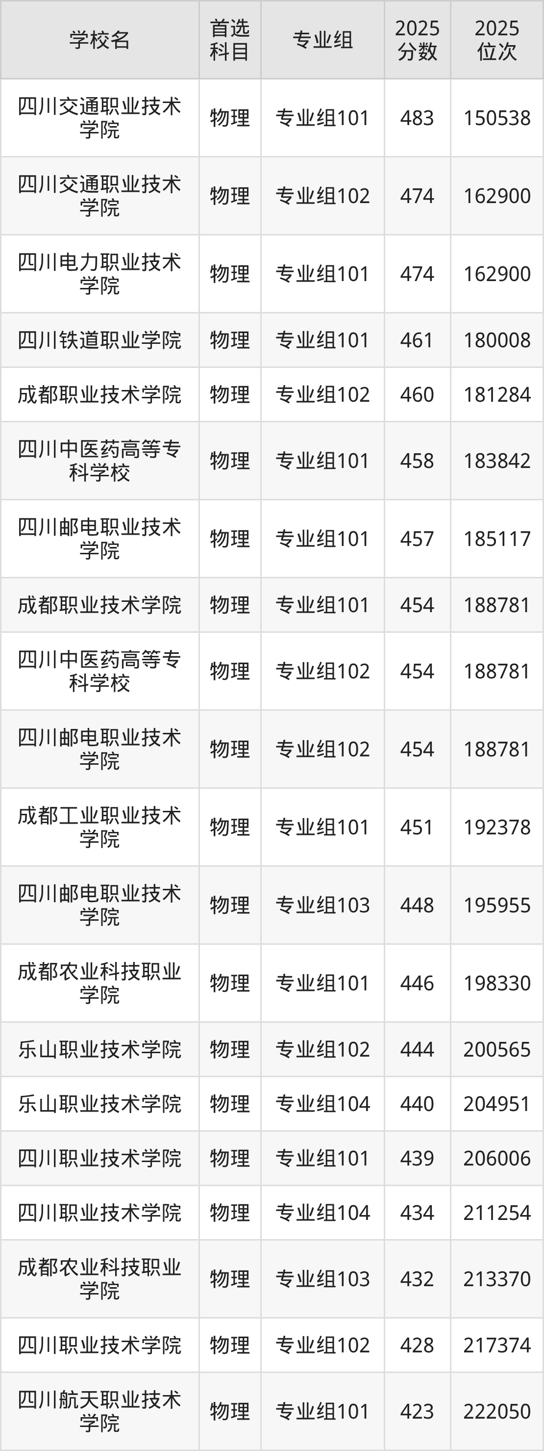 四川交通职业技术学院专业组101:483分、位次150538名;