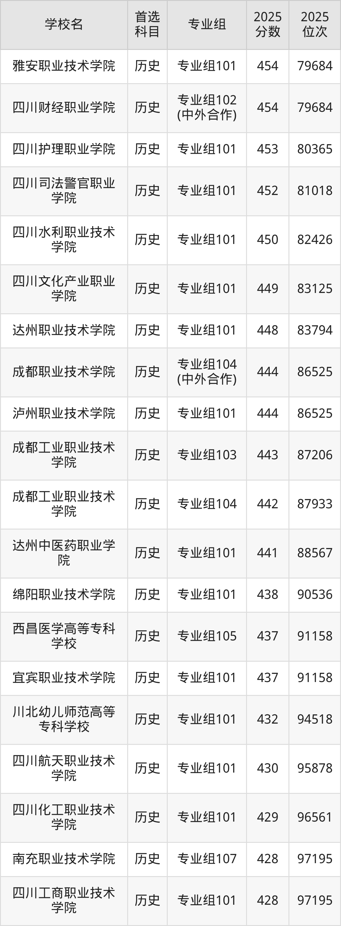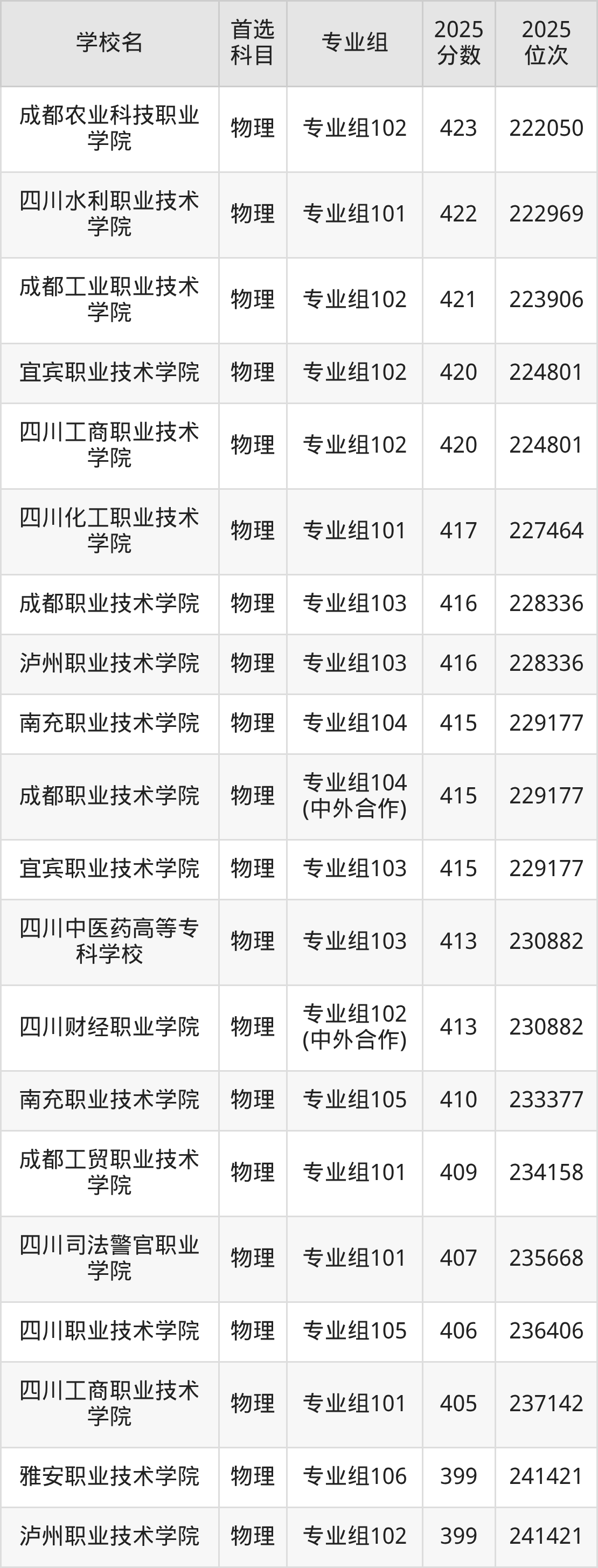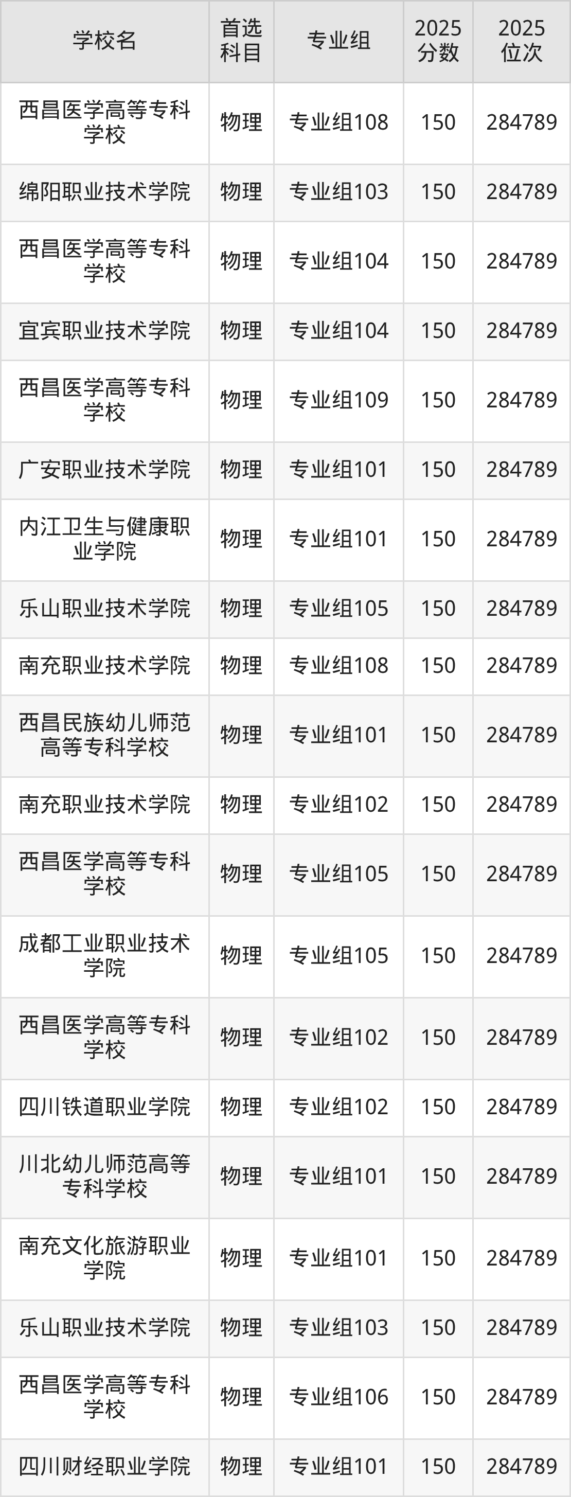 成都职业技术学院专业组102:460分、位次181284名。