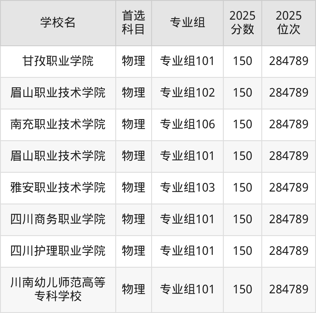 四川最好考、收分最低的公办大专院校是:川南幼儿师范高等专科学校(专业组101)、乐山职业技术学院(专业组104)、广安职业技术学院(专业组101),2025最低分150分、最低位次177978名。