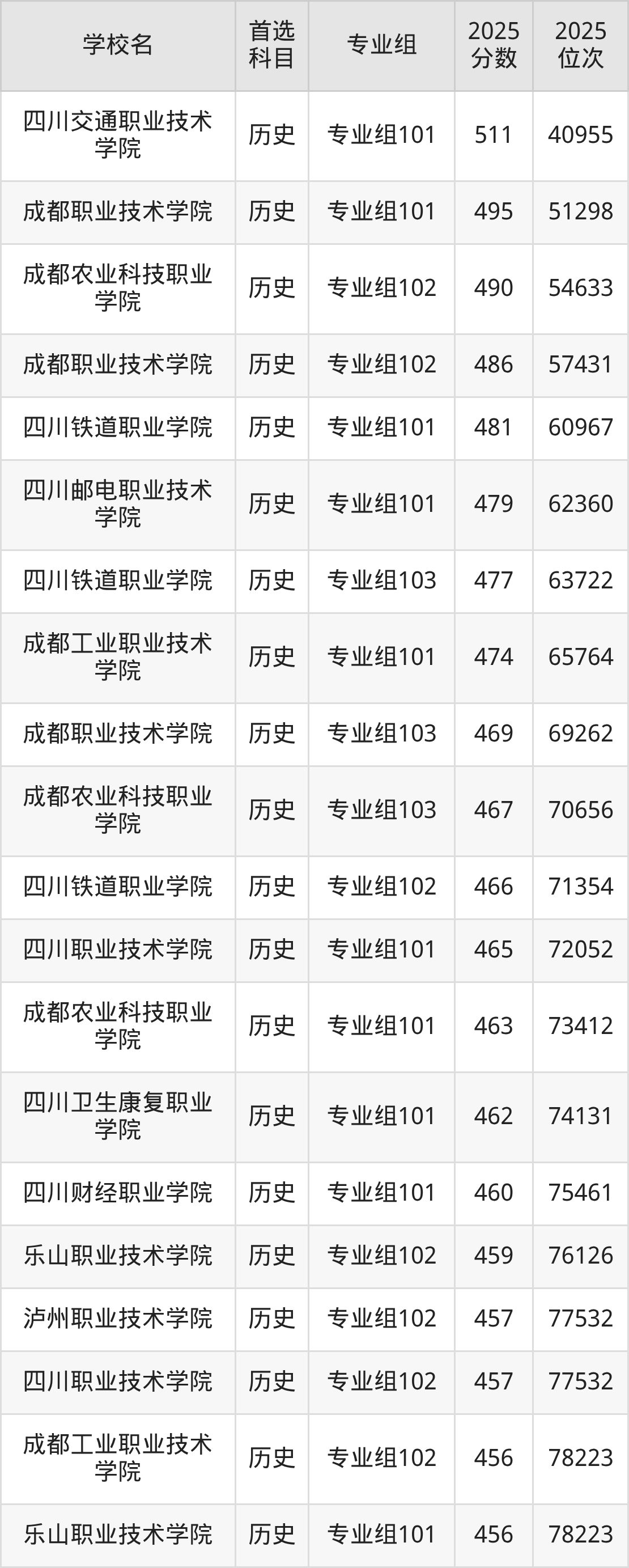 四川交通职业技术学院专业组101:511分、位次40955名;