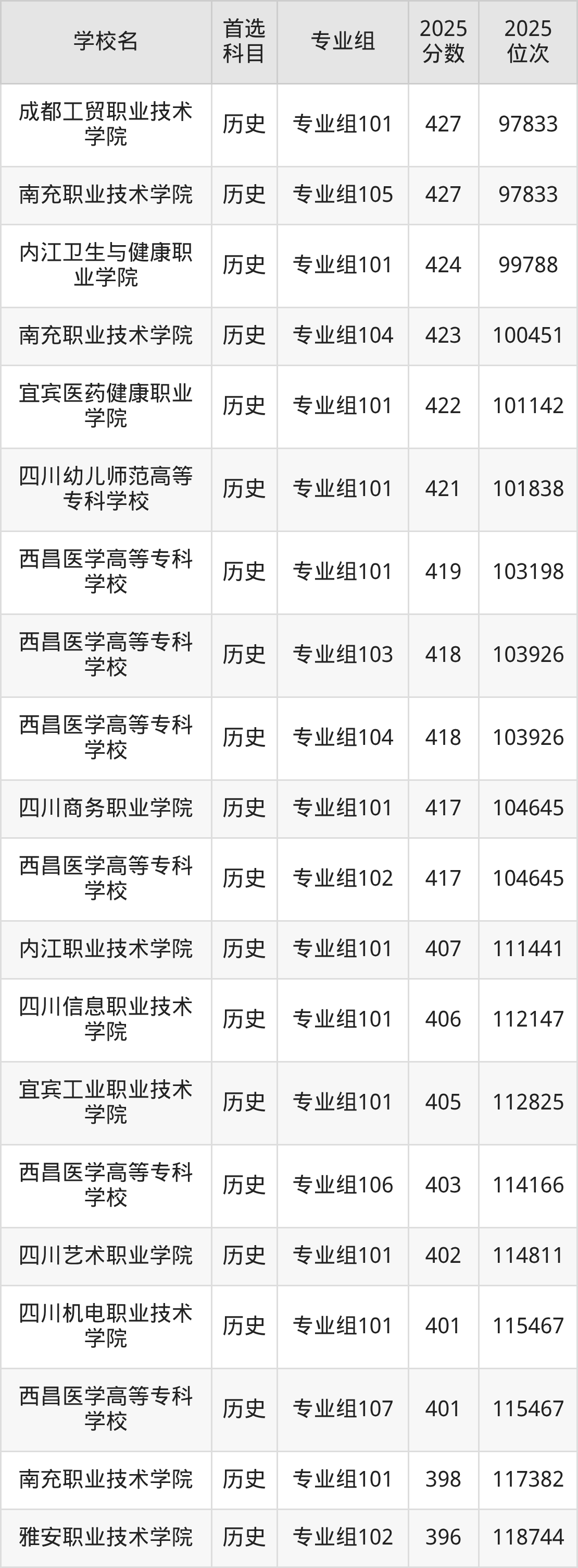 成都职业技术学院专业组102:486分、位次57431名;