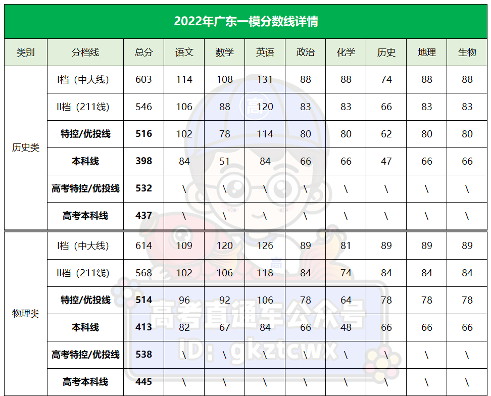 小编在此还整理了2022年广东一模的分数线,详情如下:
