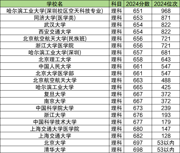 位次在1000以内的院校共有19个,能读的基本都是顶尖985院校,其中较为好考的有哈尔滨工业大学(深圳校区空天科技专业)、同济大学(医学类),这些院校的分数在651-653分之间,位次在871以内。