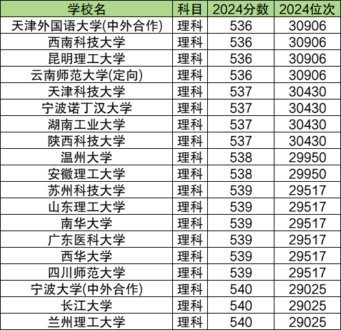 位次在30000左右的基本属于省重点院校,分数在536-540分之间,比一本线高31-35分之间。其中位次相对靠后的有天津外国语大学(中外合作)、西南科技大学、昆明理工大学、云南师范大学(定向)、天津科技大学。