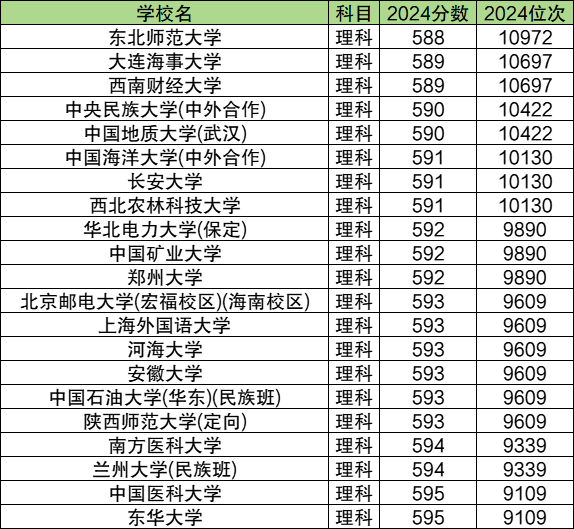 位次在10000左右的基本属于985或实力较强的211院校,分数在588-595分之间,比一本线高83-90分。其中位次相对靠后的有东北师范大学、大连海事大学、西南财经大学、中央民族大学(中外合作)。