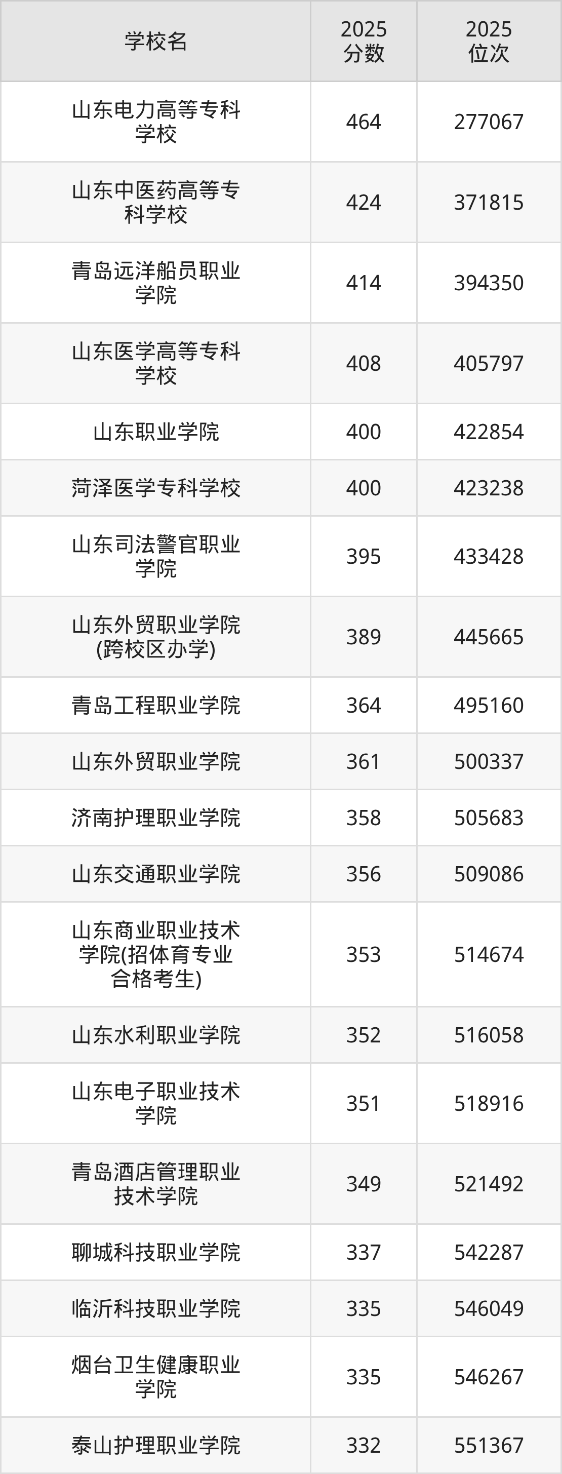 山东职业学院:400分、位次422854名。