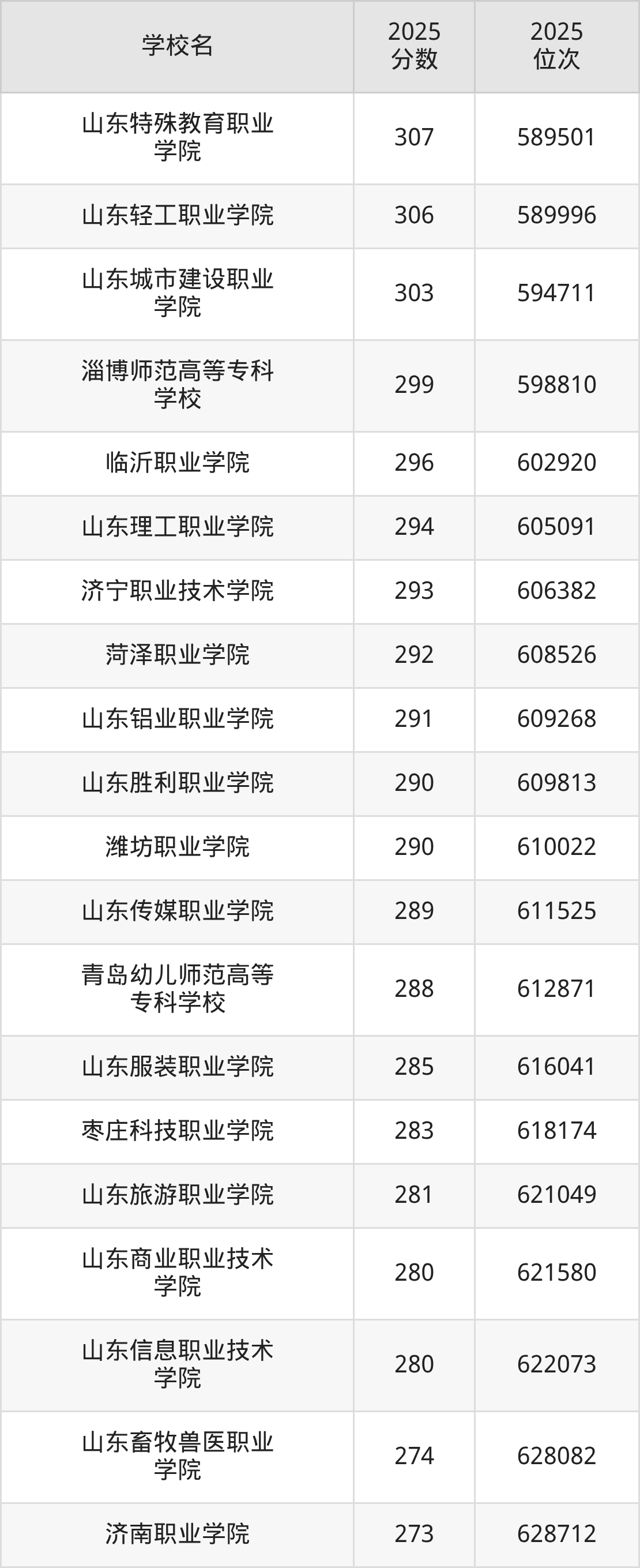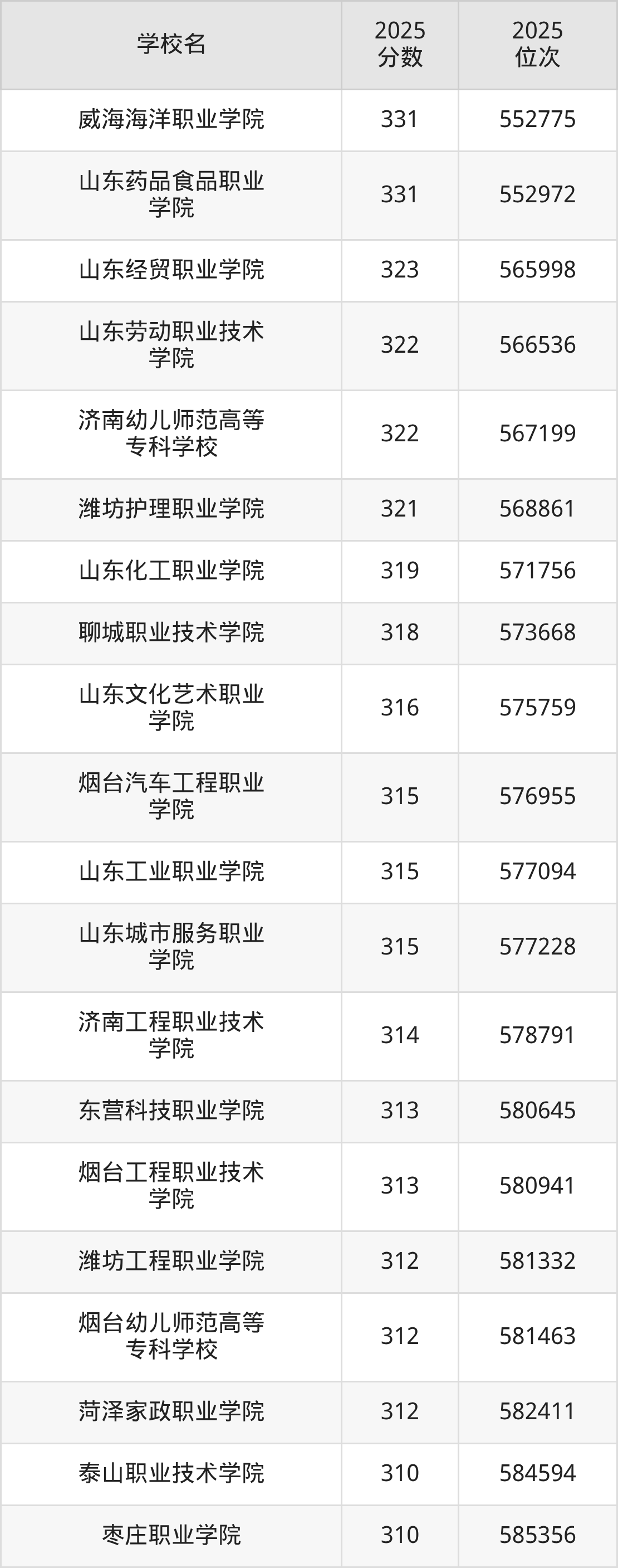 2025年山东公办大专院校排名一览表: