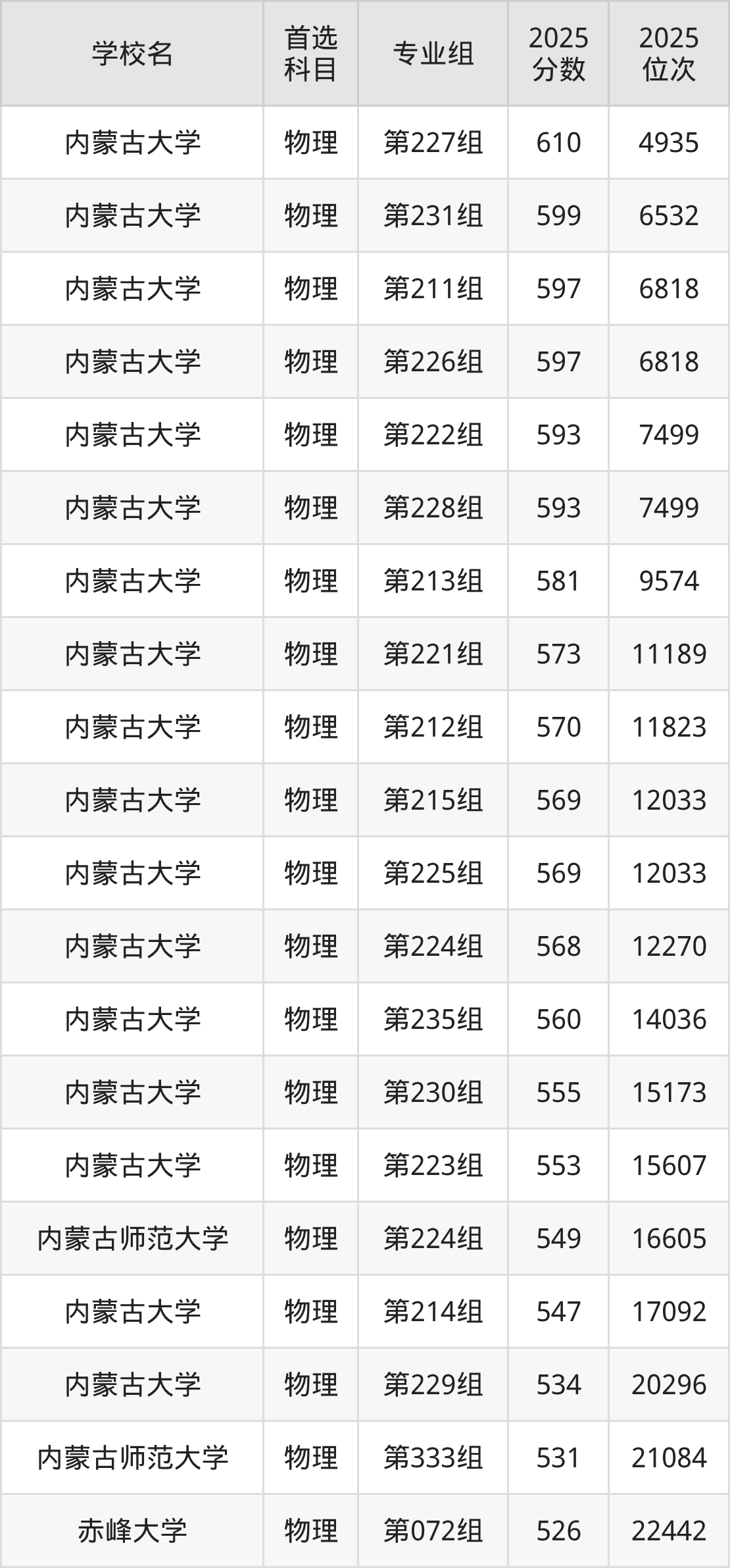 内蒙古大学第227组:610分、位次4935名;