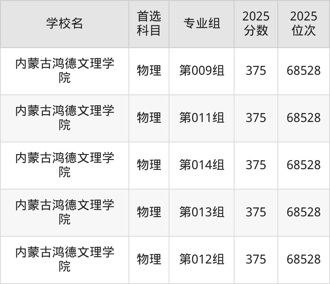 内蒙古最好考、收分最低的文科大学是:内蒙古大学创业学院(第006组)、内蒙古鸿德文理学院(第009组)、内蒙古鸿德文理学院(第011组),2025最低分375分、最低位次68528名。