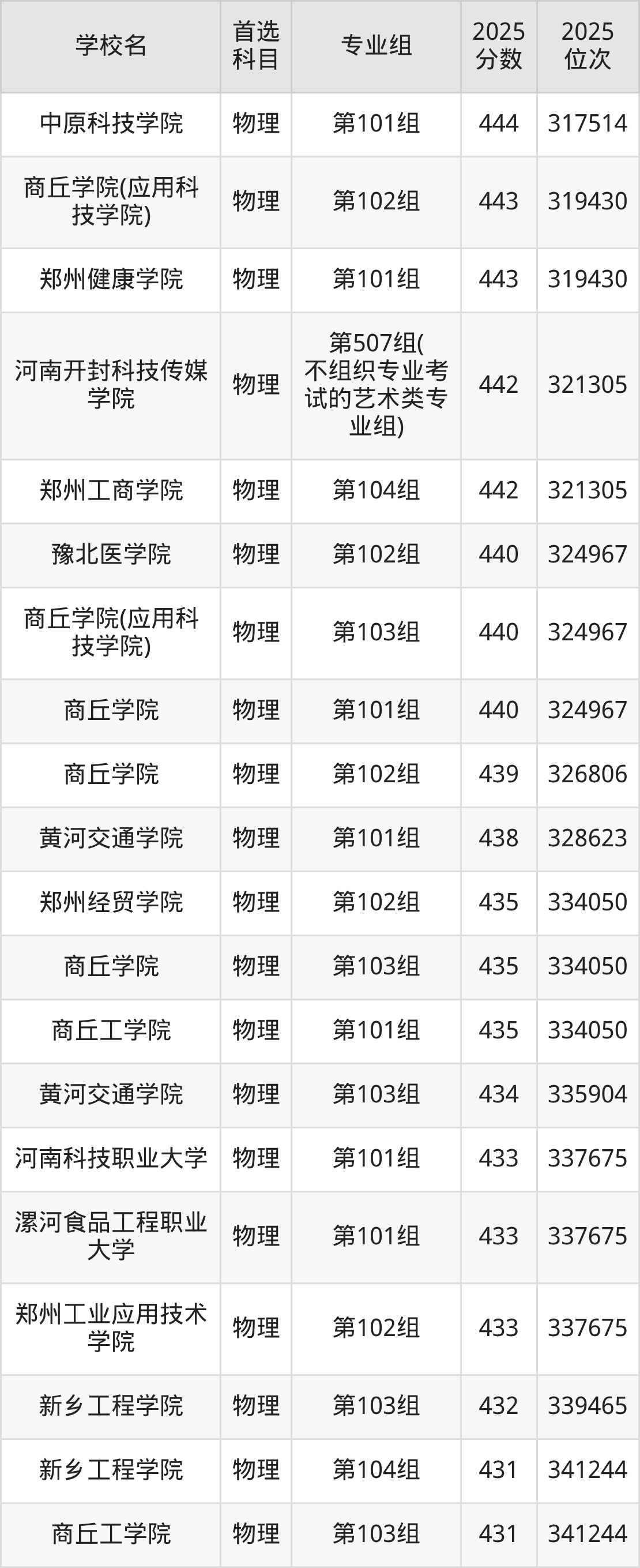河南开封科技传媒学院第102组:505分、位次58484名;