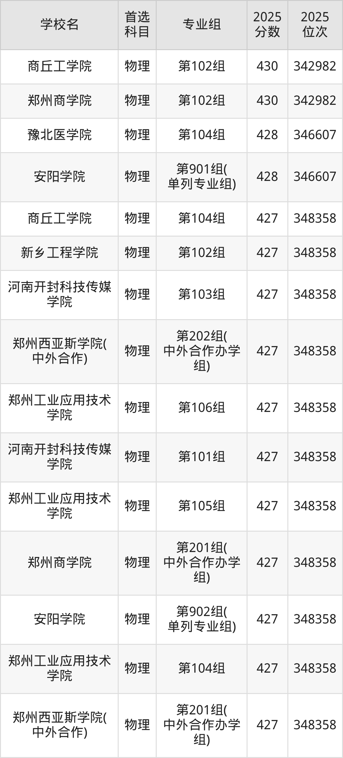 河南最好考、收分最低的民办本科大学是:商丘工学院(第104组)、新乡工程学院(第102组)、河南开封科技传媒学院(第103组),2025最低分427分、最低位次348358名。