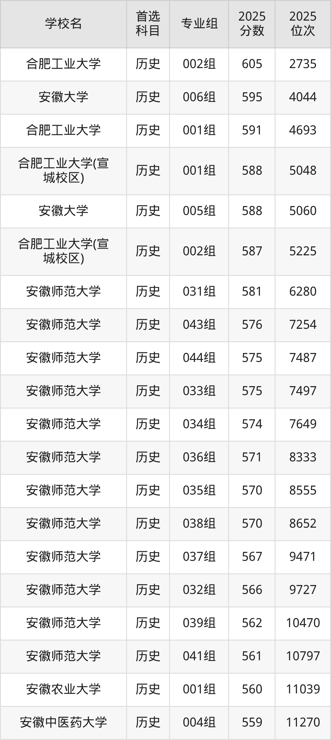 合肥工业大学002组:605分、位次2735名;
