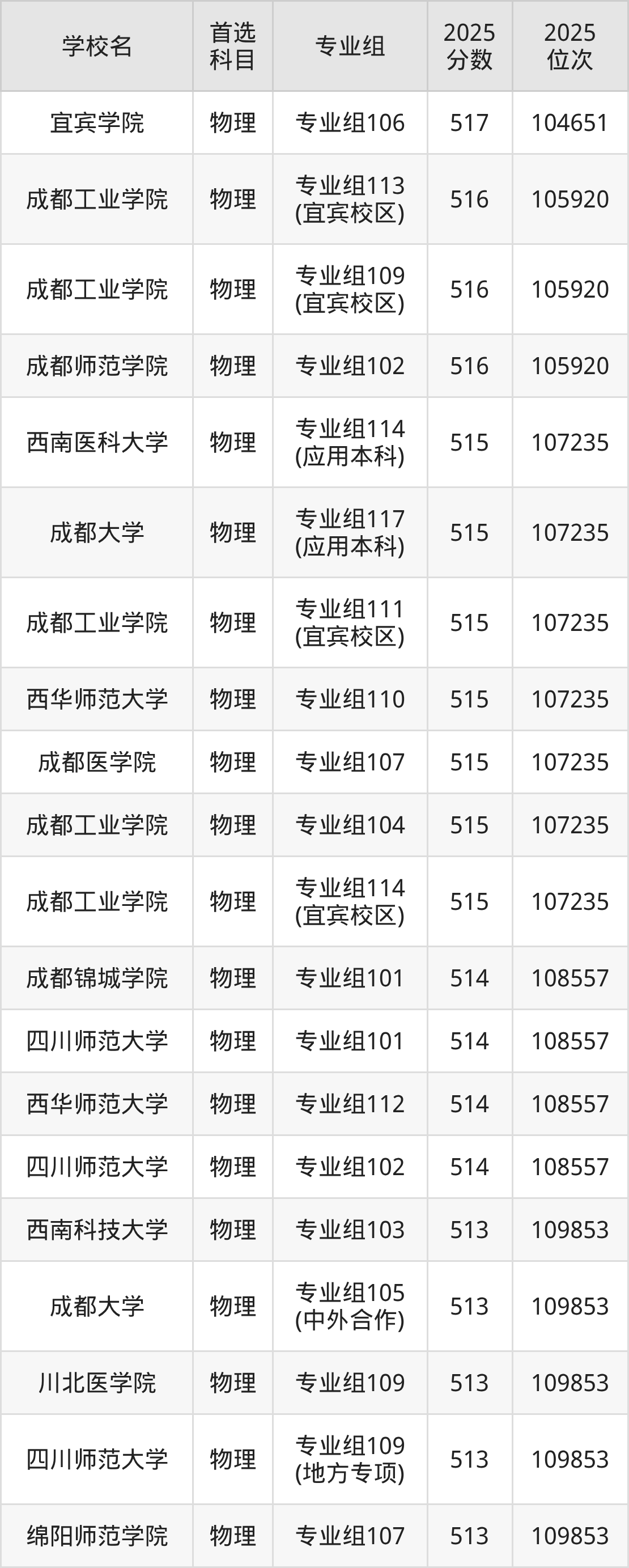 成都工业学院专业组113(宜宾校区):516分、位次105920名;