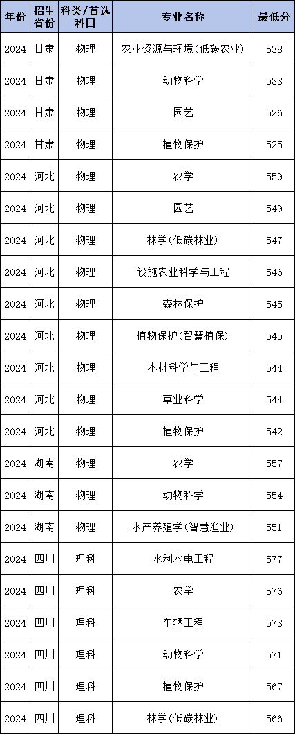 2024年华南农业大学在全国4个省实施国家专项计划招生,录取分数线范围为525分到577分,收分最低是甘肃物理类、收分最高是四川理科。下面是华南农业大学国家专项计划最低分汇总: