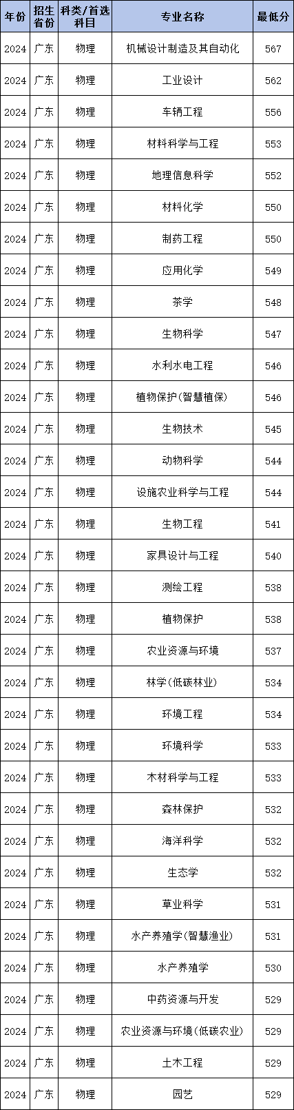 2024年华南农业大学地方专项计划在广东录取最低分物理类为529分,物理组收分最低的专业为中药资源与开发、农业资源与环境(低碳农业)、土木工程和园艺。