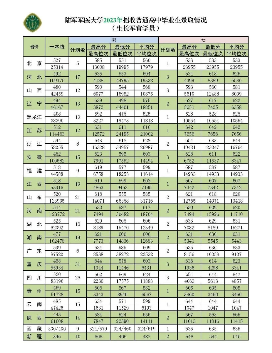 篇幅有限,以下是陆军军医大学2023年在各省提前批招生录取最低分情况,供参考: