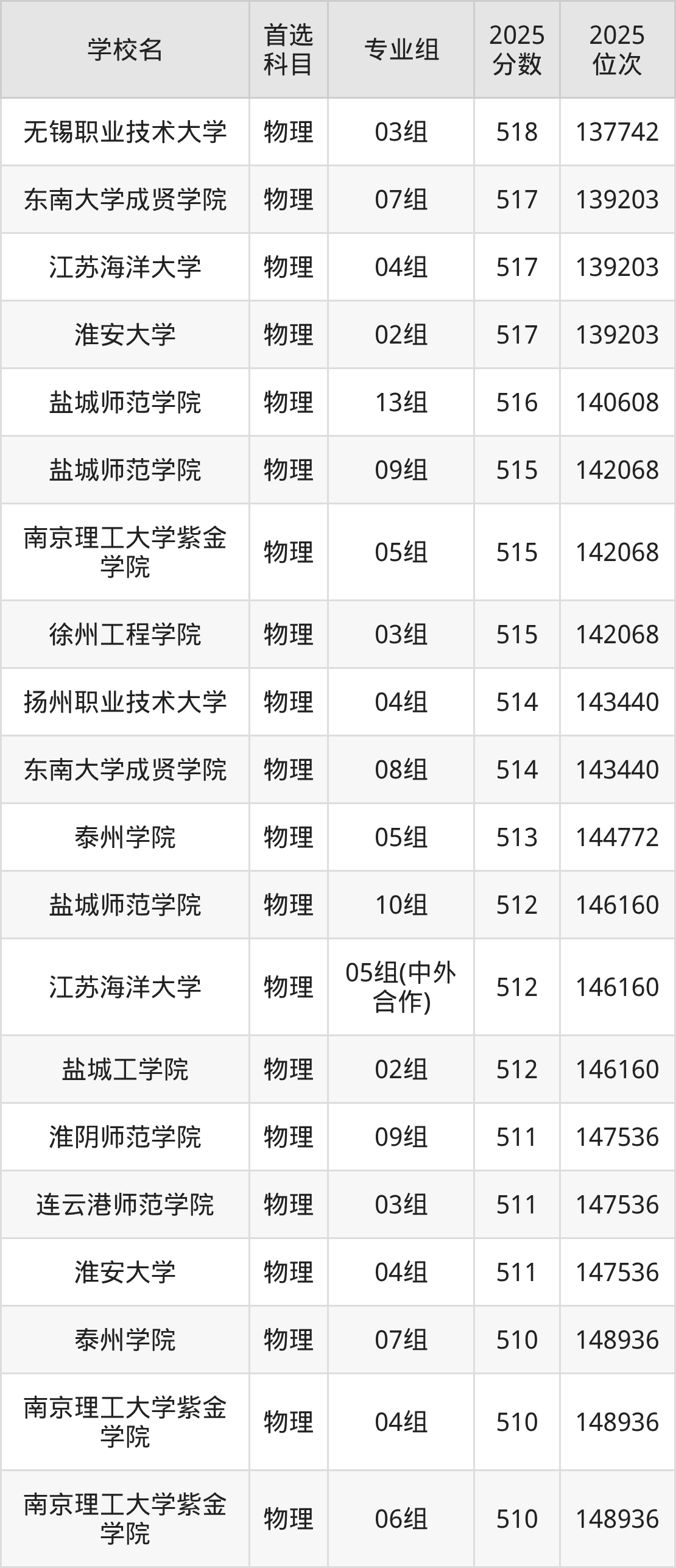 无锡职业技术大学03组:518分、位次137742名;