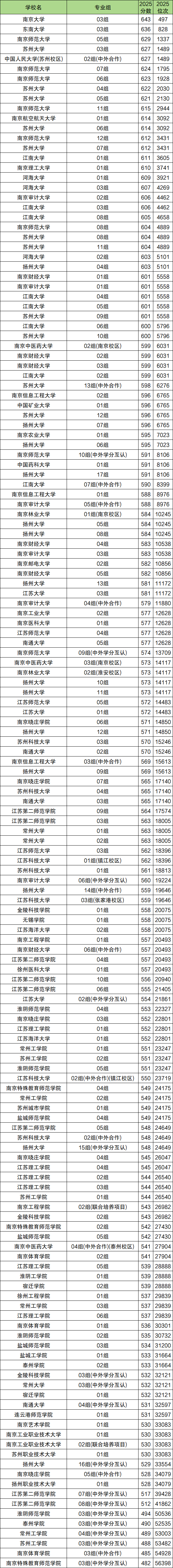 2025年录取分数线最高的是南京大学,03组2025年最低分是643分,超本科线161分。从省排名来看,最低需要在500名左右才有机会被录取。