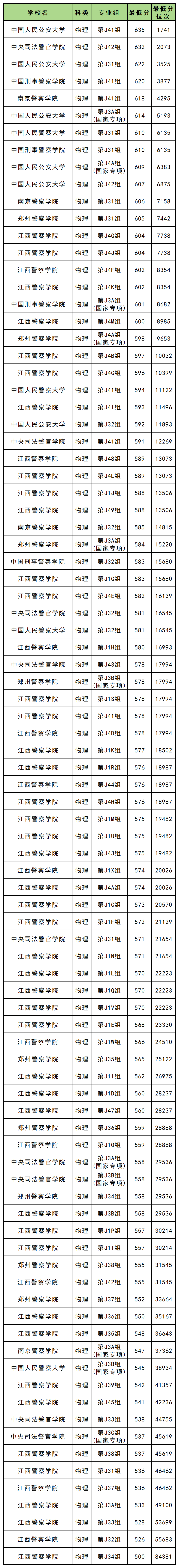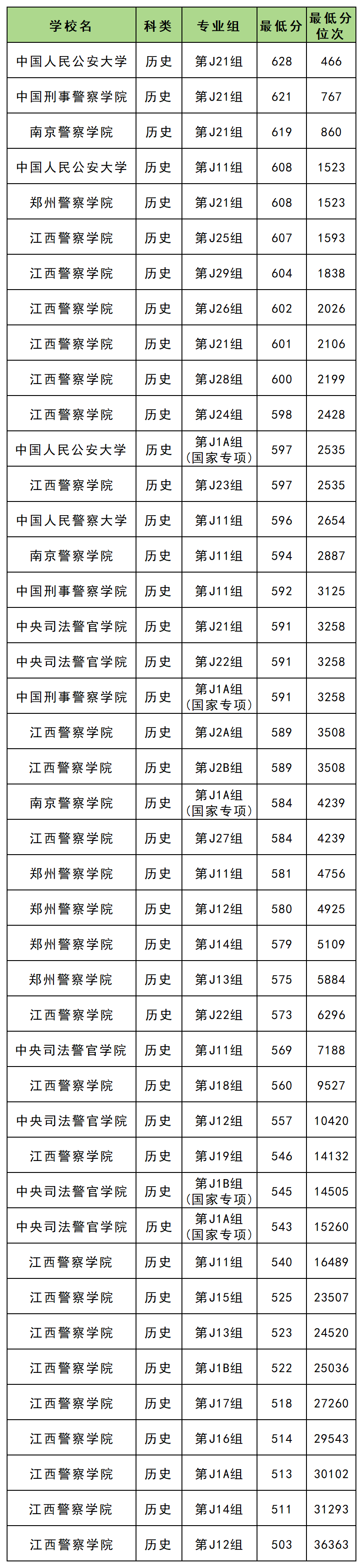 中国刑事警察学院:最低分583分(第J32组)、国家专项(第J3A组)最低分601分。