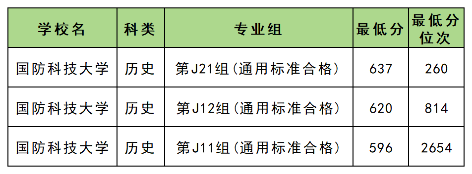 首选历史军校招生中,最低分学校是国防科技大学第J11组(通用标准合格),2025年最低投档分数线均为596分;