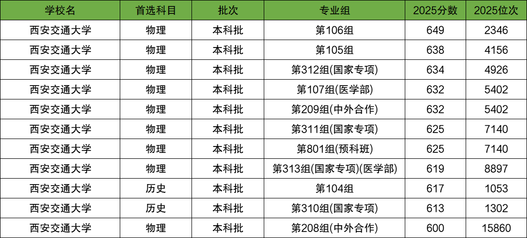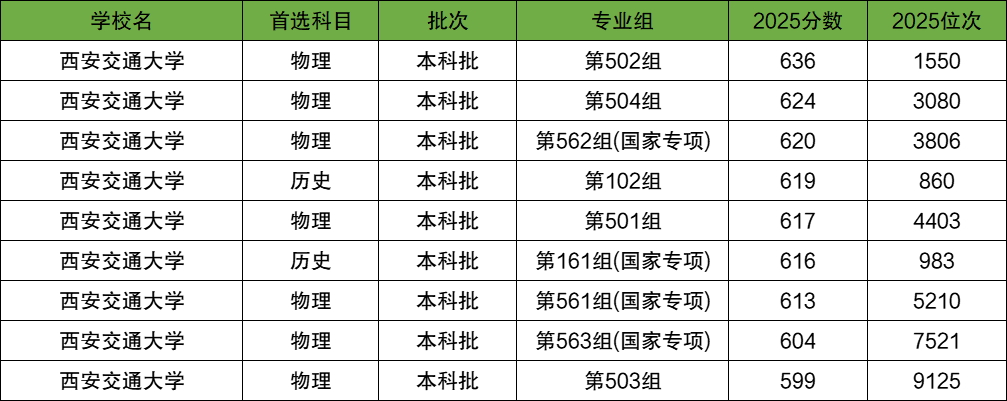 2025年西安交通大学在湖南所有专业组的分数线为: